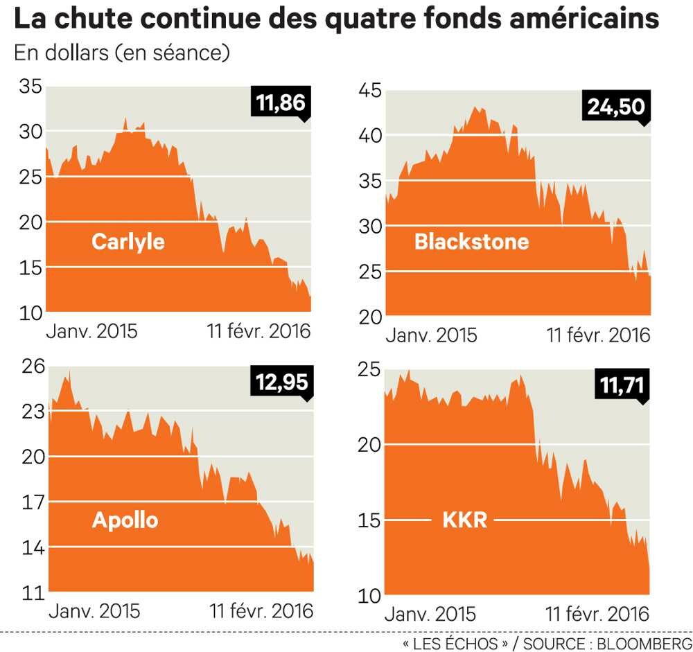 Ces acteurs sont affectés par la baisse de valorisation de leur portefeuille, mis à la valeur de marché, en particulier dans l’énergie avec la chute du cours du pétrole. Les volumes de cessions dans leur portefeuille s’est également ralenti. Cette mauvaise fin d’année vient compléter deux ans de dégringolade. Le cours de Blackstone, premier gérant mondial avec 336 milliards de dollars d’actifs, évoluait encore jeudi bien en deçà de son cours d’introduction (23,8 dollars contre 35 dollars en 2007), celui de Carlyle, numéro deux du secteur touchait son plus bas historique, à 11,3 dollars, et celui d’Apollo n’était pas loin non plus de ses plus bas, à 12,52 dollars.